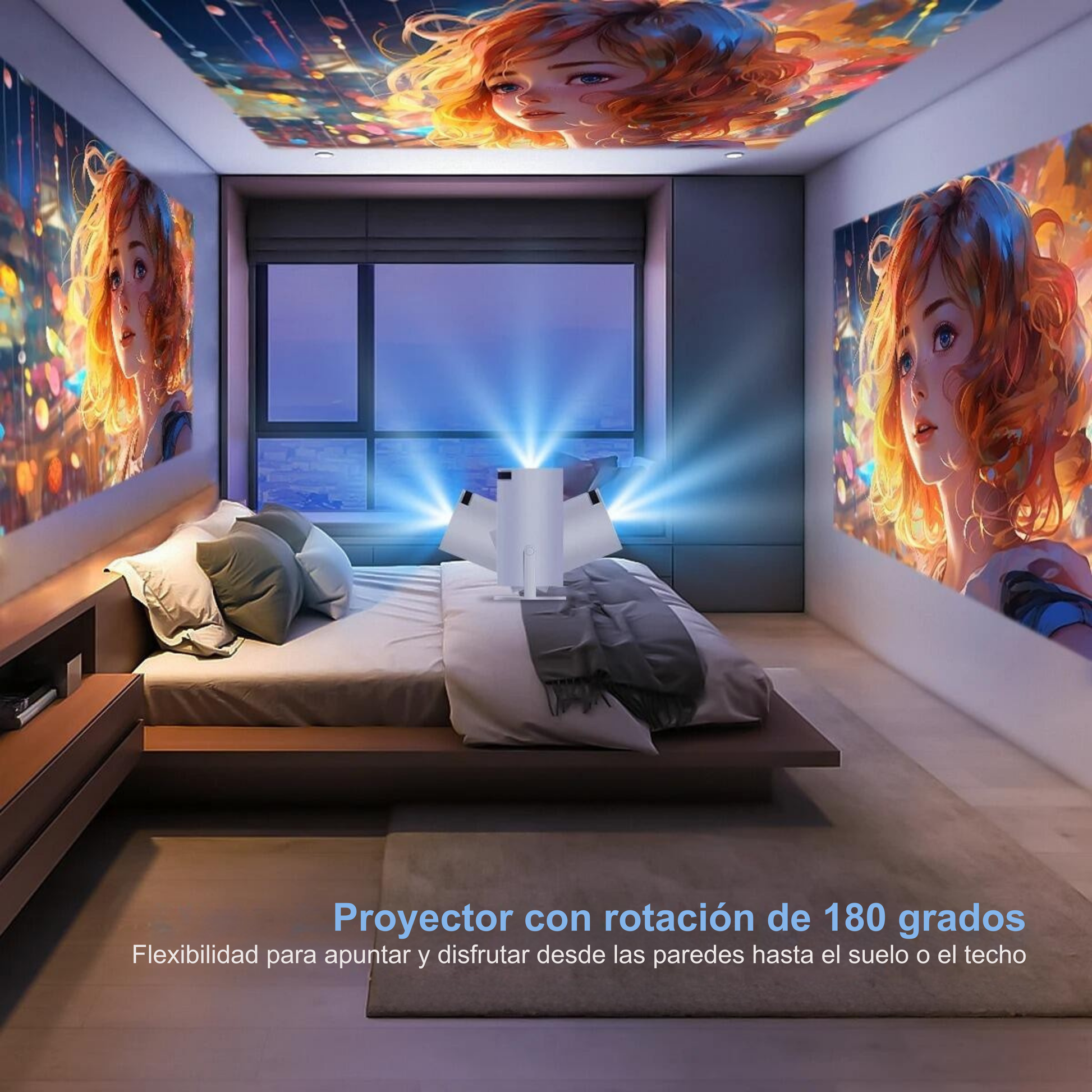 - Proyector de teléfono con rotación de 180° y pantalla gigante de 200 pulgadas: Este innovador proyector está equipado con una función única de rotación de 180°, lo que le permite dirigir el haz del proyector en todas las direcciones, incluso hacia el techo. Ideal para una experiencia cinematográfica cómoda desde su cama, es capaz de proyectar una imagen nítida en un área de hasta 200 pulgadas, creando una pantalla muy amplia en su espacio personal.